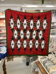 Diah kwam van de week haar kerstballenquilt laten zien. Door de punten afwisselend rood en groen te maken ontstaat dit leuke effect. Het moet nog