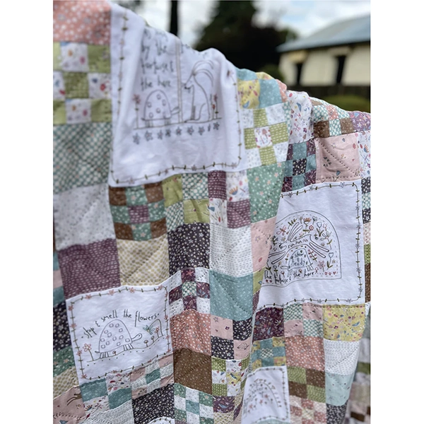 De quilt is gemaakt van lekker simpele blokjes en leuke Stitchery paneeltjes.