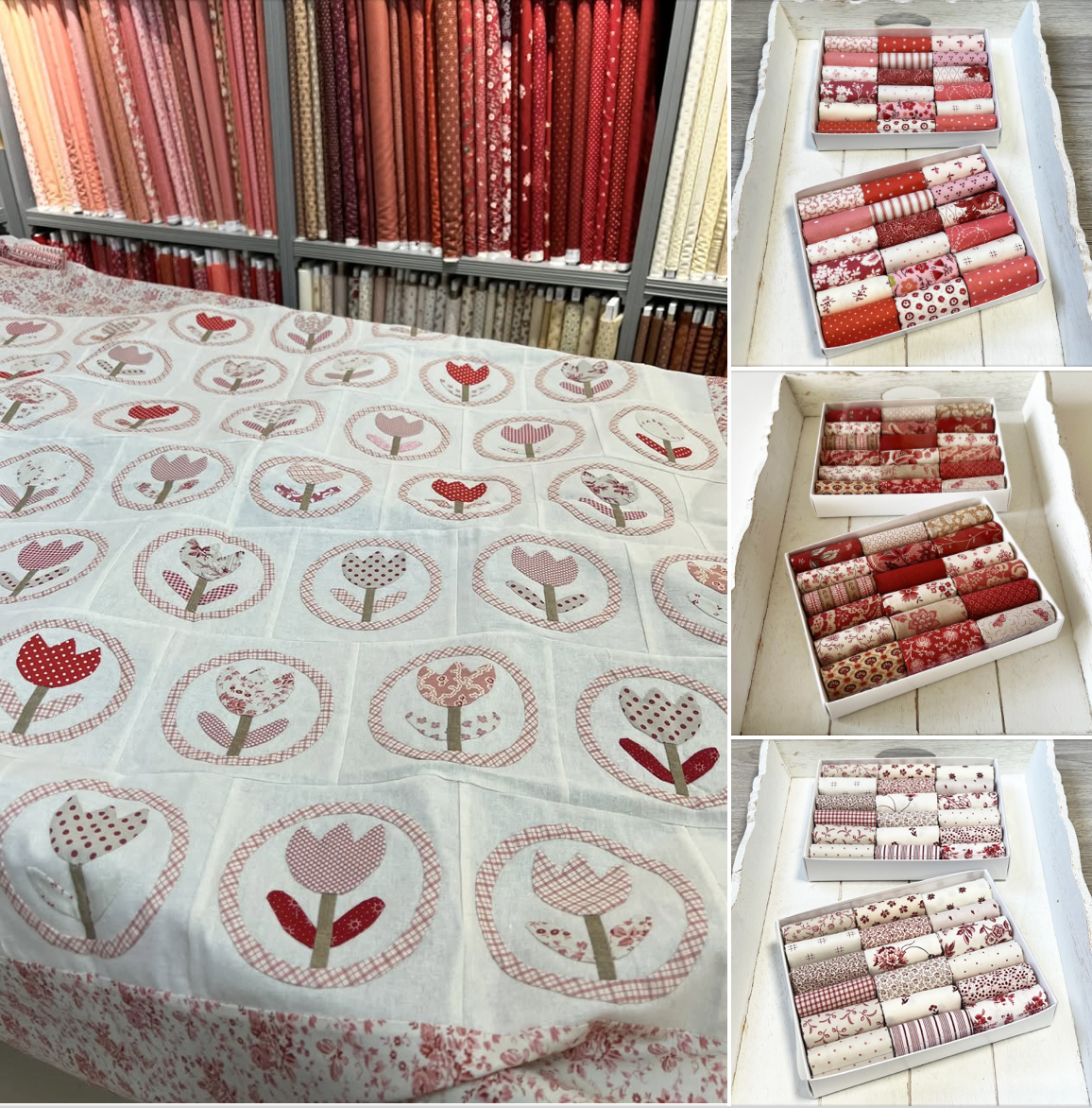 Connie maakte ‘The Garden at Ederveen Quilt’ nu eens in het rood! Is het geen plaatje? Wil jij ook zo’n rode quilt maken? We hebben daar superleuke snoepdoosjes (klik) voor. Zo kun je ieder tulpje een andere kleur geven. Hij is prachtig Connie! Veel plezier bij het doorquilten!